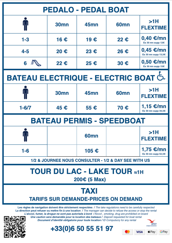 Nous sommes ouverts d'Avril à Octobre 7/7 dès que le lac et la météo permettent de naviguer